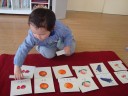 カードやミニチュアで知らないものの名前を覚え、文字~単語~文~文章という構成を学びます。